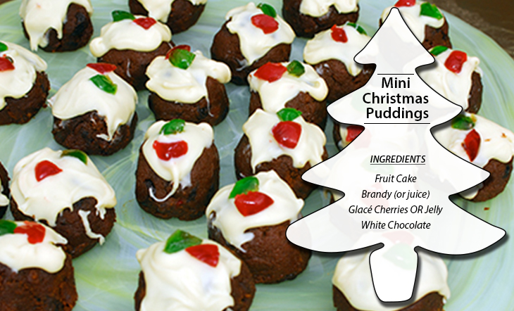 5. Melt the white chocolate and place about half a teaspoonful on top of each pudding. Before it sets, top each pudding with a piece each of green and red cherries or jellies, then allow to set before serving.