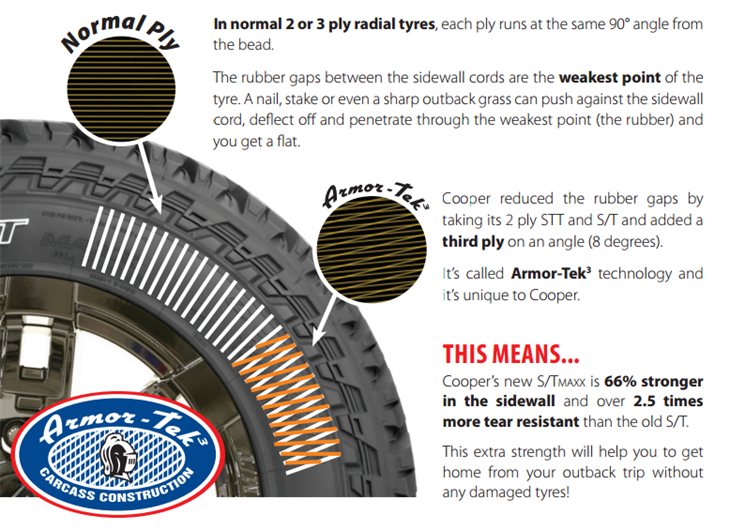 Cooper’s unique innovation Armor-Tek3 acts like a shield of armour for the sidewall of your tyres, which means the chances of sidewall damage is greatly reduced. This will give you peace of mind knowing your tyres are protected from the harsh conditions that Australia has to offer. Tested in Australia and America, these tyres have been developed to ensure they really work! The S/TMAXX completed more than 2 million kilometres of test track, road and laboratory testing to ensure that it is Cooper’s best ever heavy duty all-terrain tyre. While the STT PRO was put through its paces by Cooper Tires engineers across more than 1,000,000kms of testing throughout Australia’s harshest terrains, ensuring it delivers unprecedented traction and performance off-road without sacrificing its on-road capabilities.