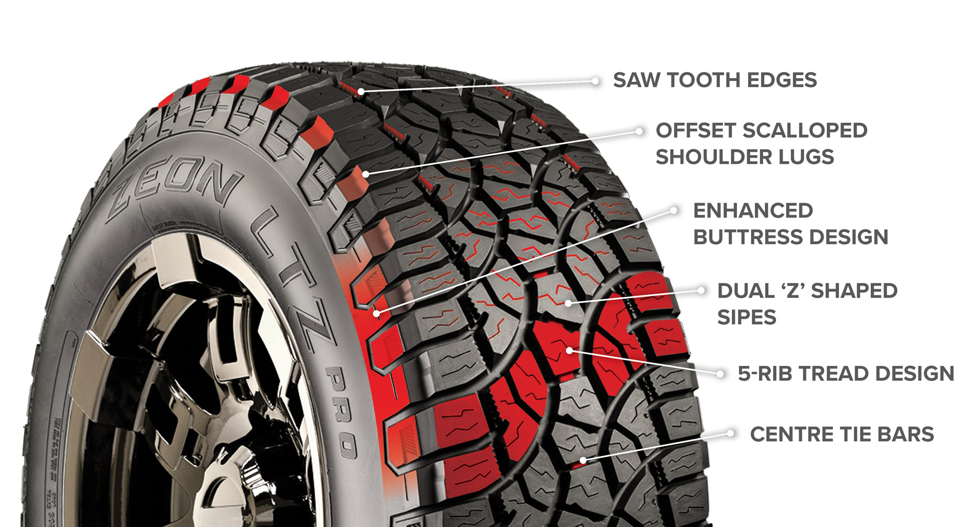 There are three things to look for when selecting a tyre – tread design (T), carcass construction (C) and the compounds (C) used to build it – T.C.C. The Cooper Zeon LTZPRO represents the latest generation of tyre technology measured by T.C.C.