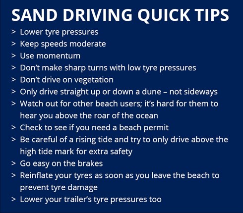 Remember to keep an eye on your vehicle’s temperature gauge as the extra strain of lugging a heavy trailer in soft sand will well and truly try your cooling system.