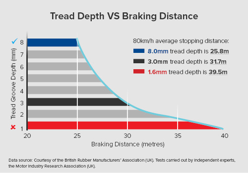 There are two main reasons why tread depth is important. More tread left means more mileage and the further your tyres will take you, but also it gives you shorter braking distances that are essential in sudden change of conditions or in wet conditions.