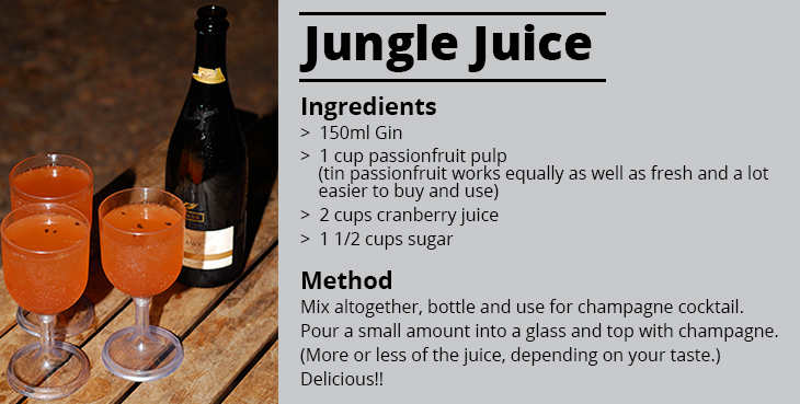 “I was given this mixture by some people we met while camped up in Kalumburu in the Kimberley many years ago,” said Viv. “It’s a nice little addition to a glass of bubbly, turning it into a champagne cocktail, and tastes delicious as well. Probably a bit too delicious! Don’t be deceived by the small amount of gin that goes into the mix – it gives the drink quite an extra ‘potency’.”